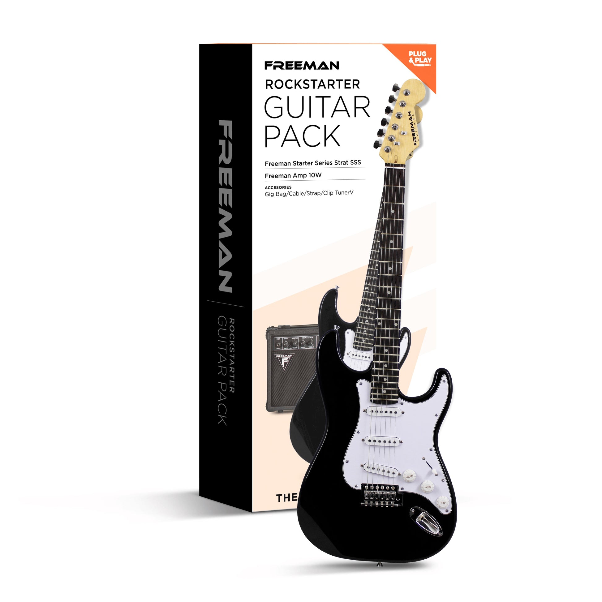 El Pack Rockstarter de Freeman cuenta con una guitarra Stratocaster con un cuerpo en madera de Tilo, un delgado mástil en Arce, que junto con al antebrazo ofrece un cómodo agarre que equilibra los contornos del cuerpo haciendo que tocar esta guitarra sea un placer. El diapasón en palo rosa garantiza una buena digitación para el principiante lo que ayuda a uun desarrollo en las técnicas para guitarras eléctricas.